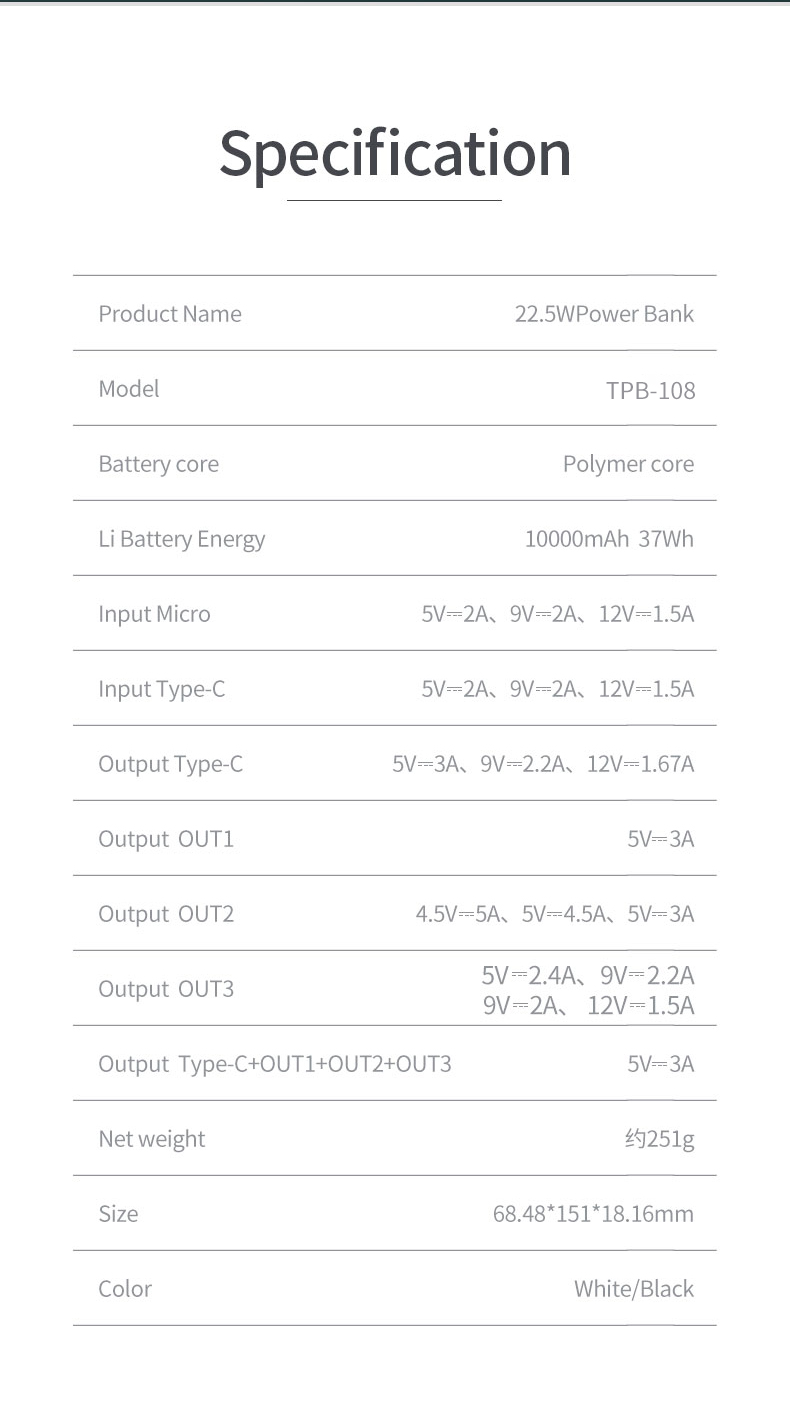 Input Type C:5V⎓3A, 9V⎓2A, 12V⎓1.5A